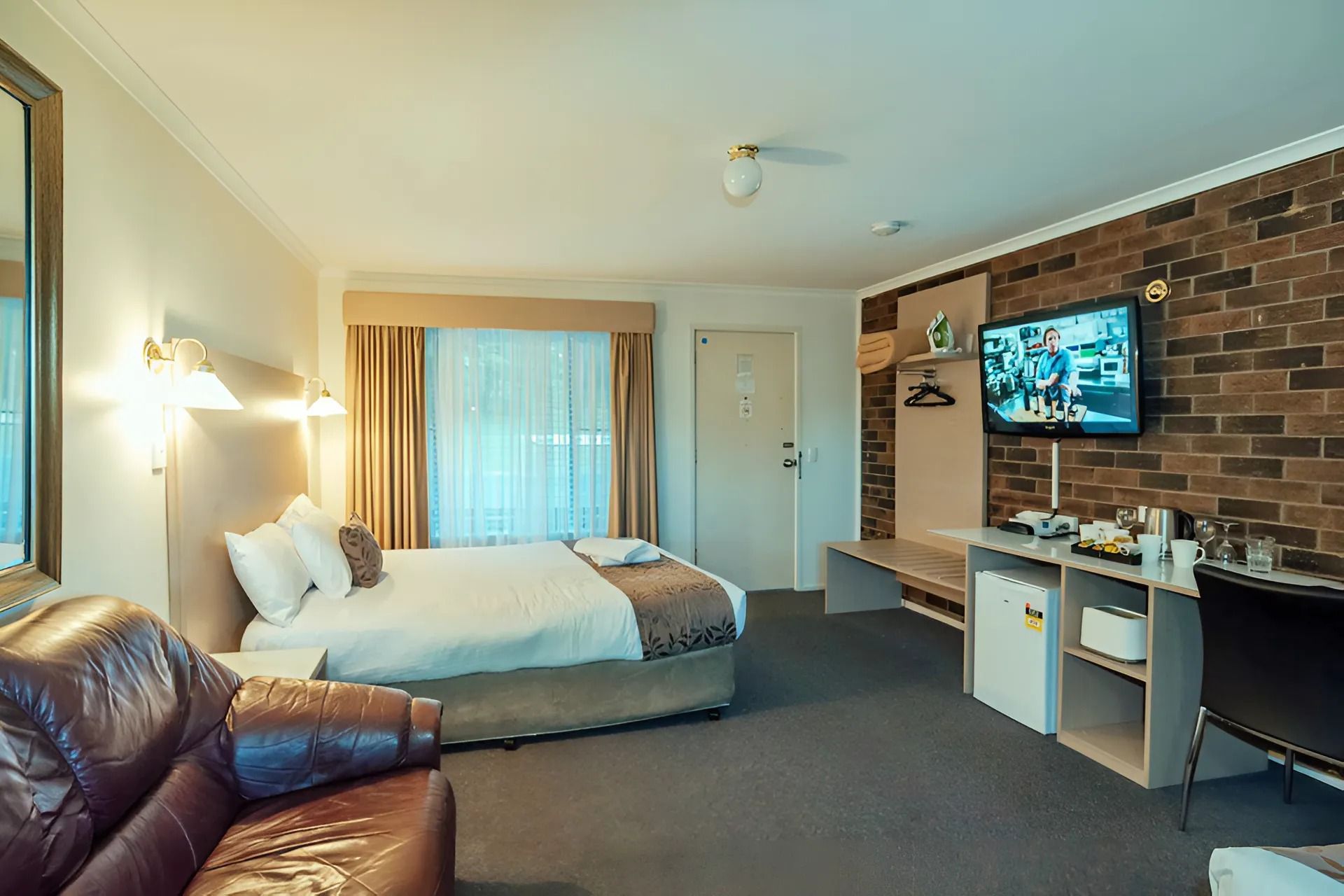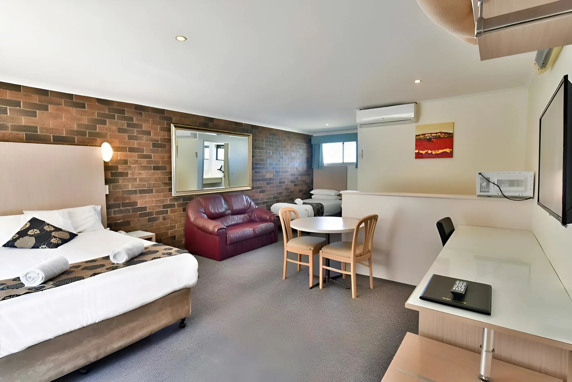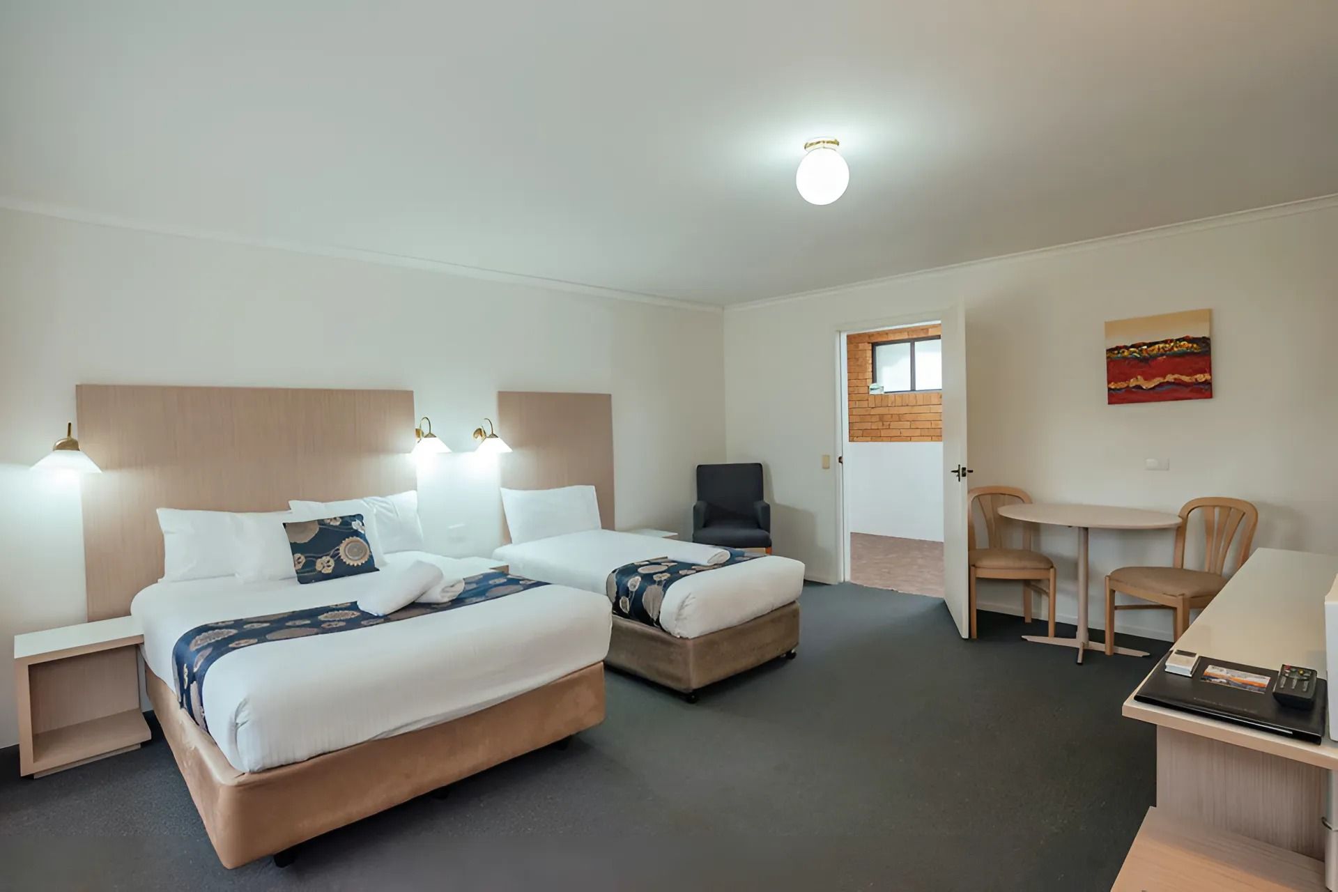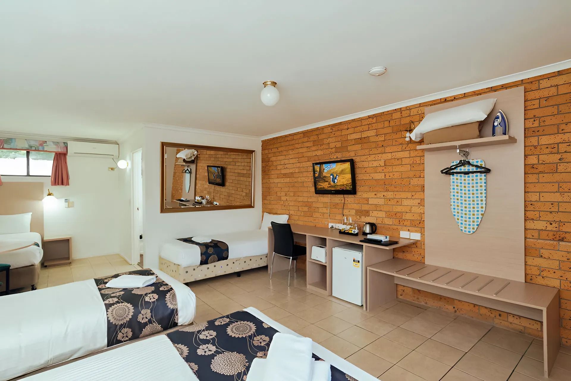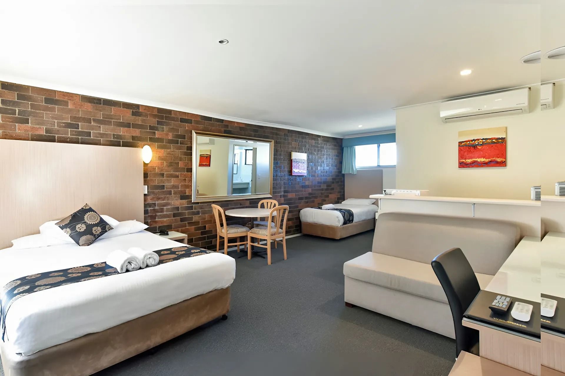 1 queen bed and 1 single bed. Flat screen TV, reverse cycle A/C, fridge, Tea/coffee making facility. Free Wifi. Ground Floor. Disable accessible room as well as pet friendly. Allocated Parking.