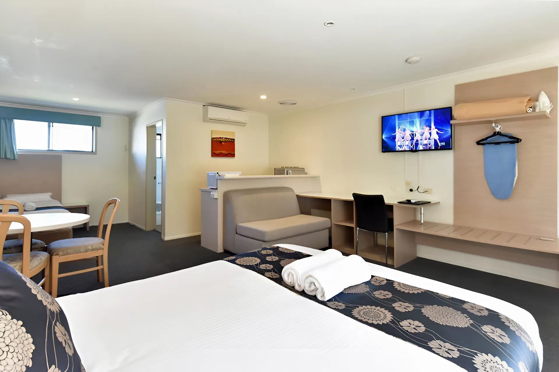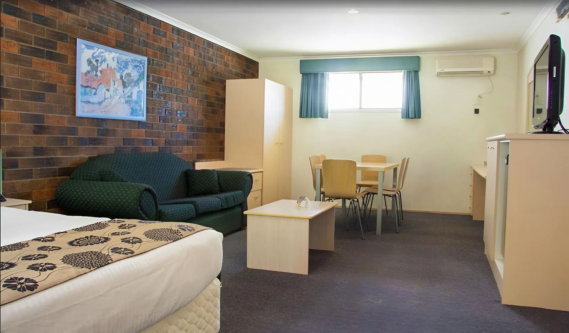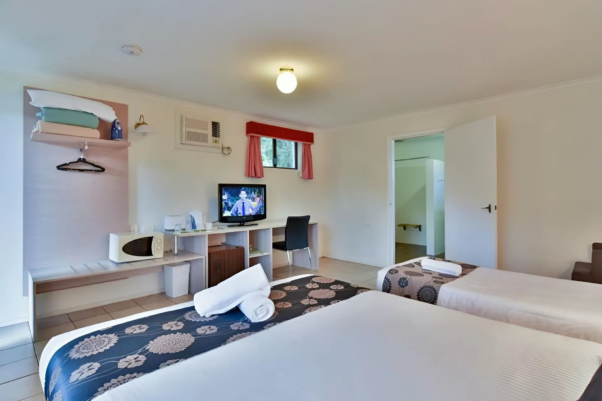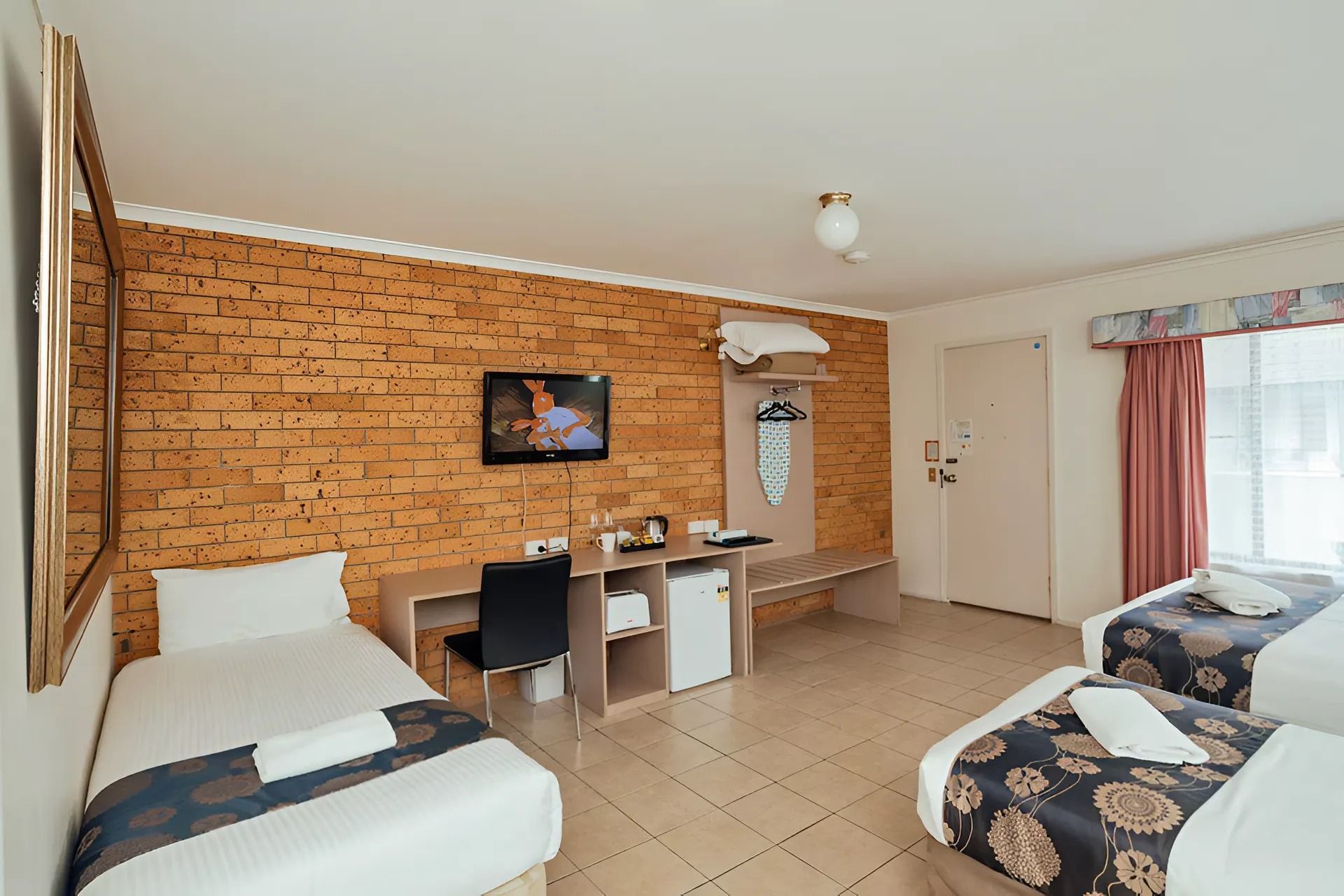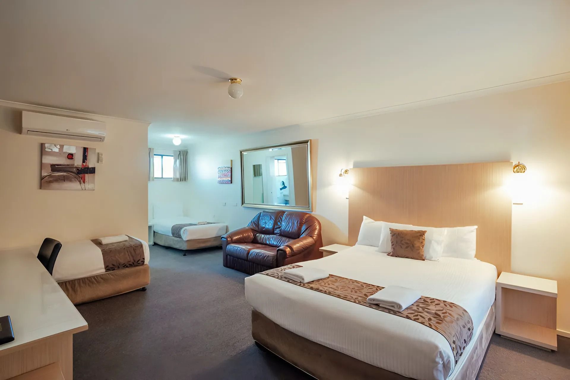 1 queen bed and 1 single bed. Flat screen TV, reverse cycle A/C, fridge, Tea/coffee making facility. Free Wifi. Ground Floor. Disable accessible room as well as pet friendly. Allocated Parking.