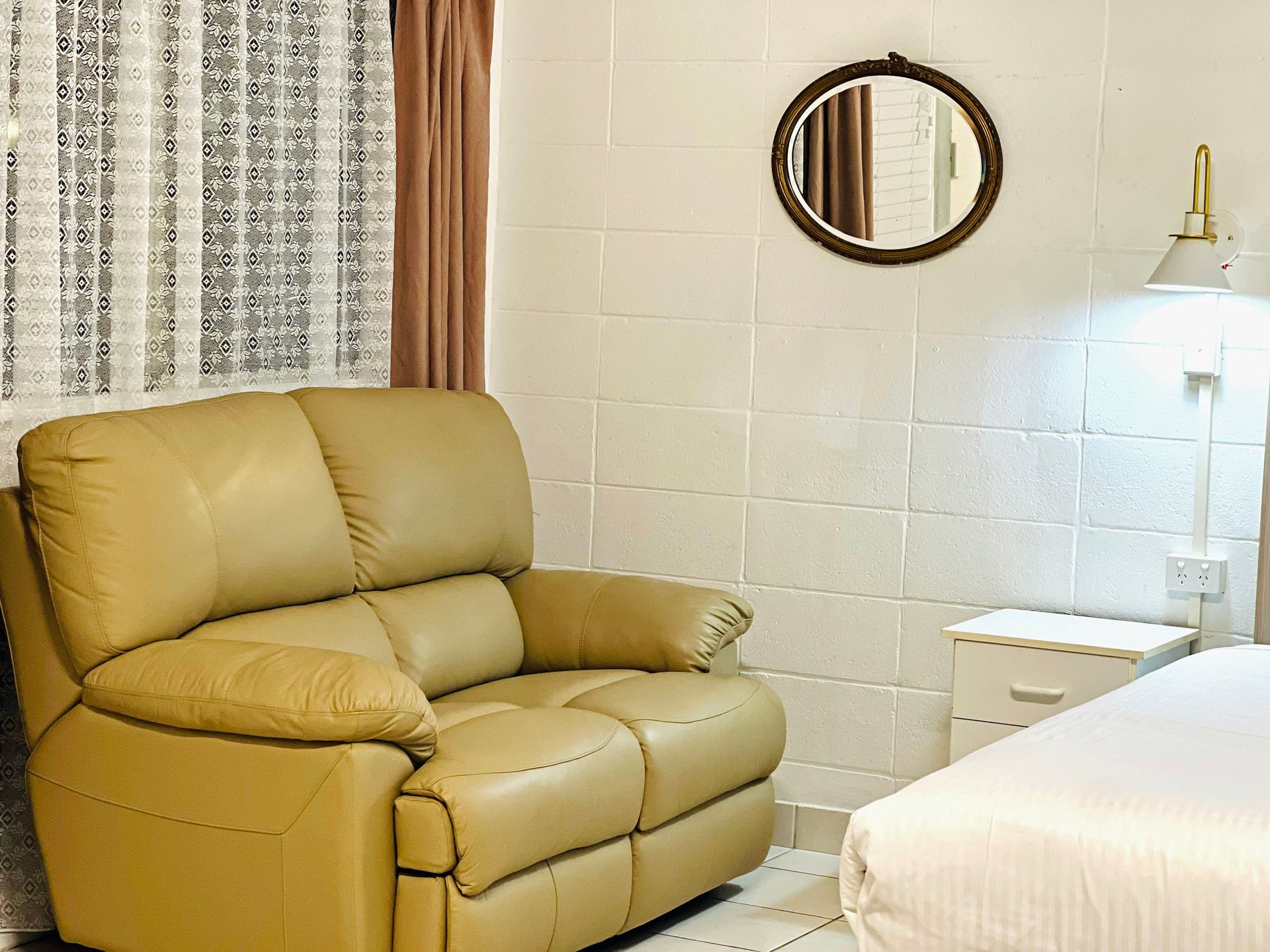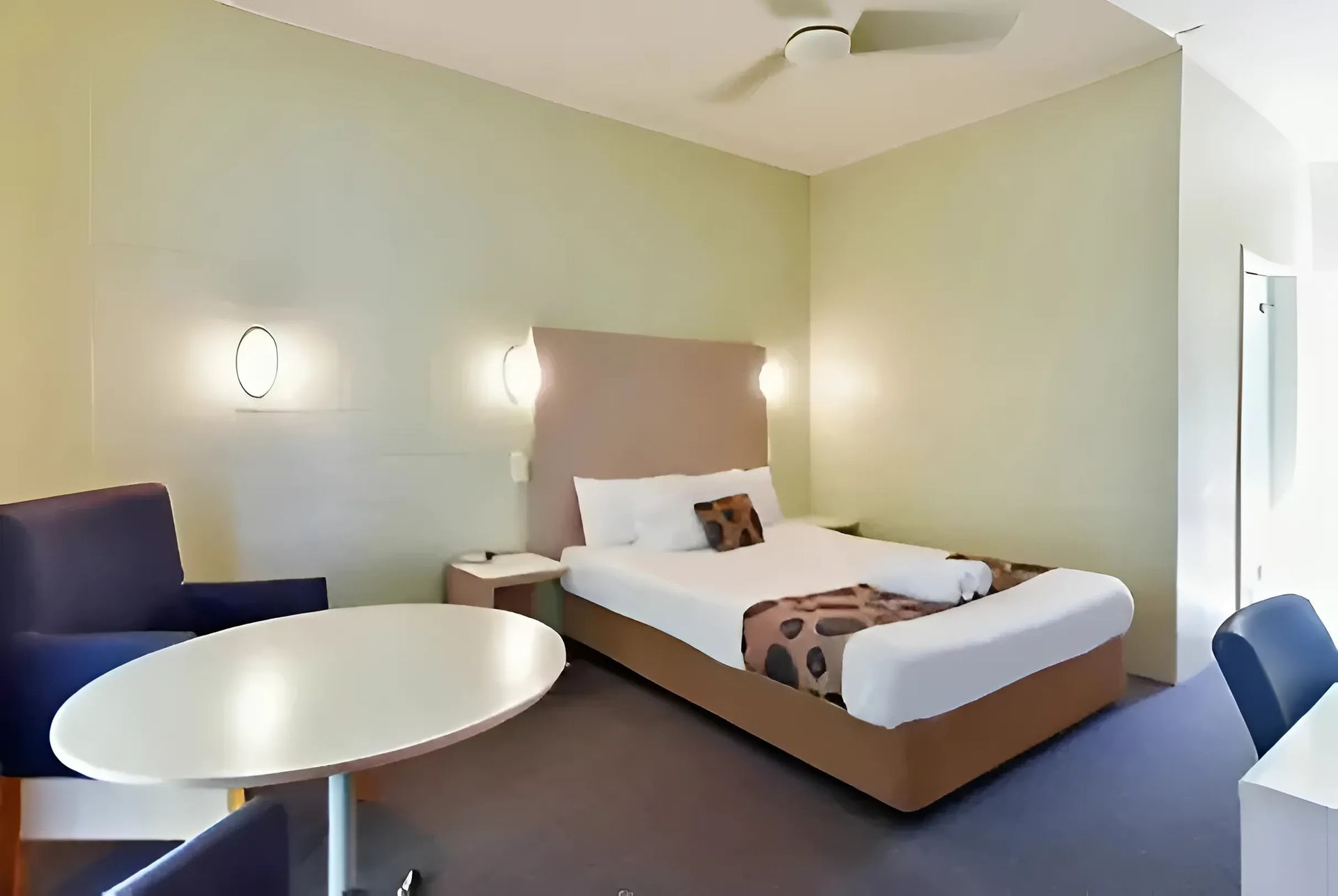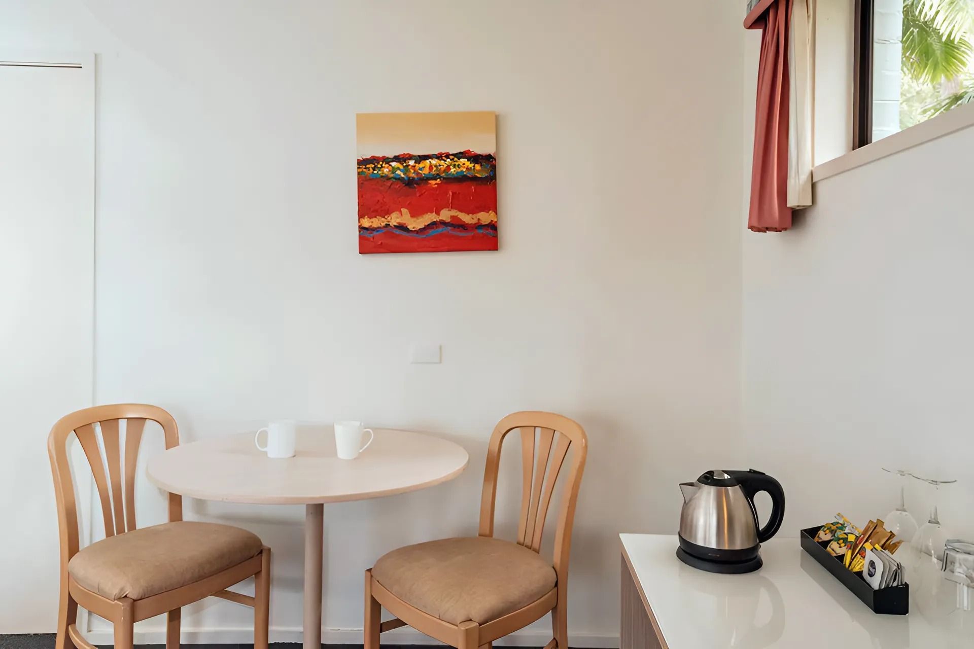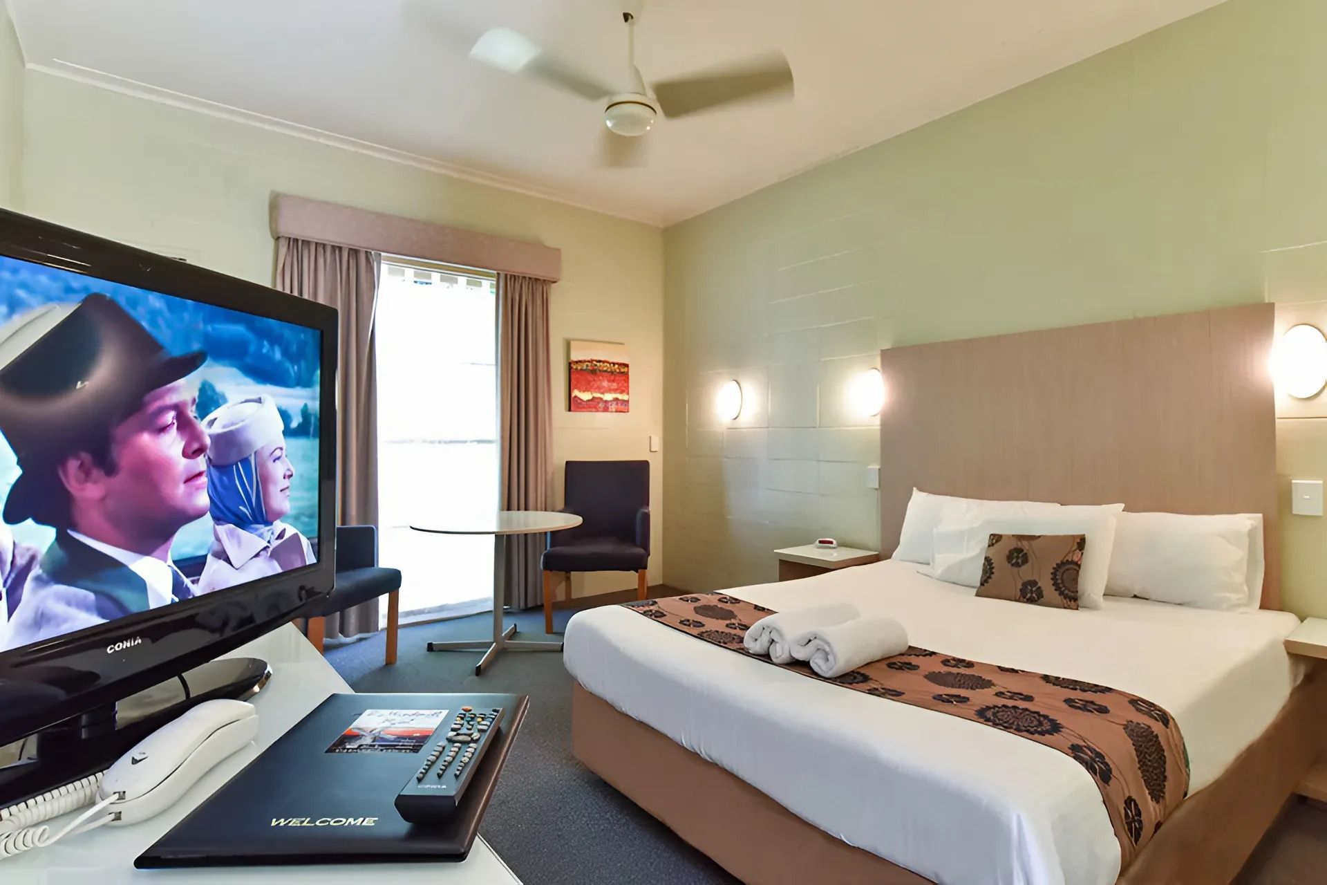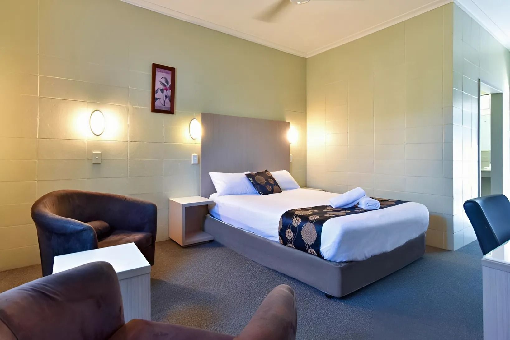 1 queen bed and 1 single bed. Flat screen TV, reverse cycle A/C, fridge, Tea/coffee making facility. Free Wifi. Ground Floor. Disable accessible room as well as pet friendly. Allocated Parking.