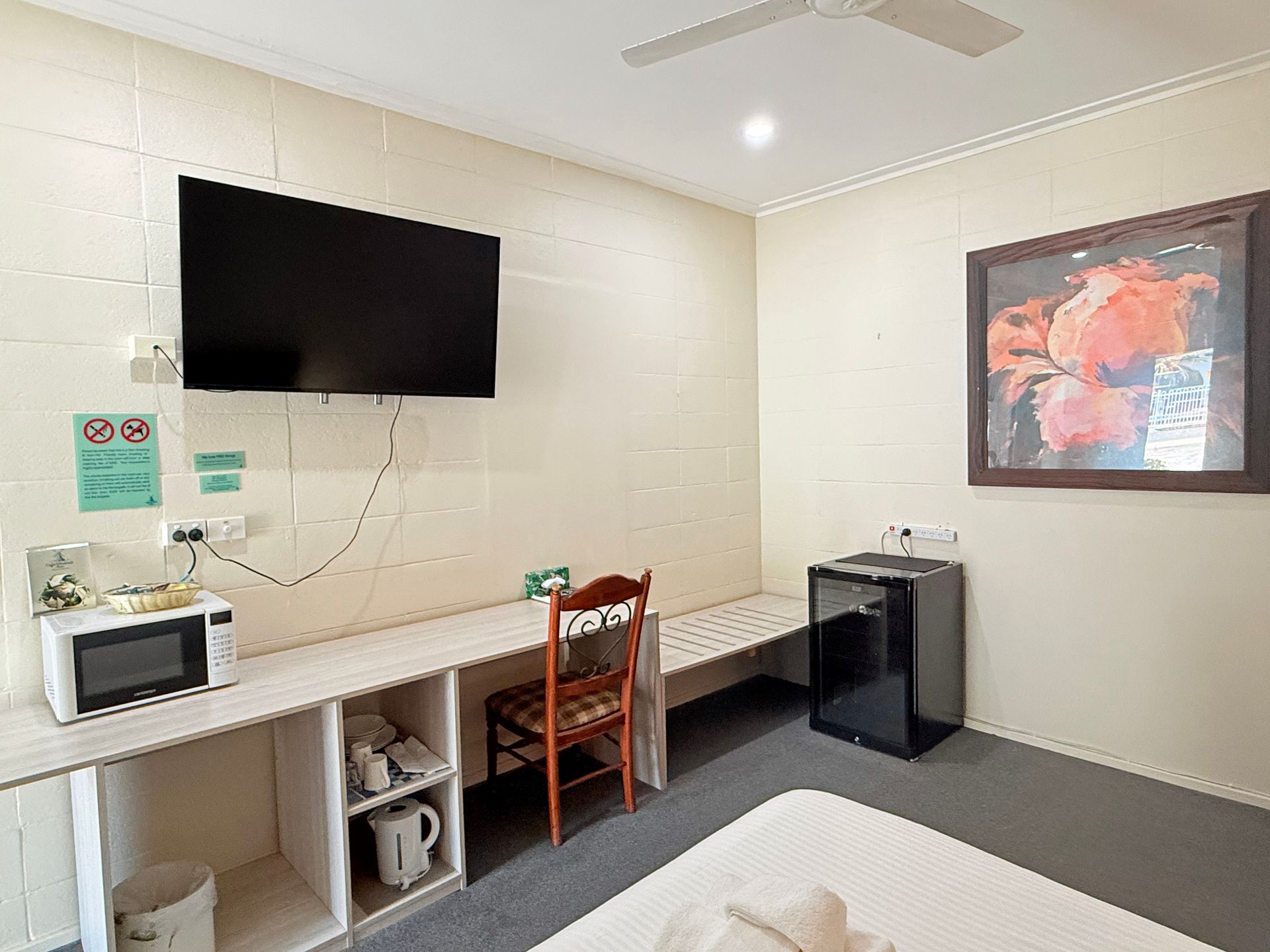 Clean and spacious ground floor suite with allocated parking. Suite has 1 queen bed and 2 single bed. Flat screen TV, reverse cycle A/C, fridge, tea/coffee making facility. Free Wifi. NO MICROWAVE. Sorry, no pets.
